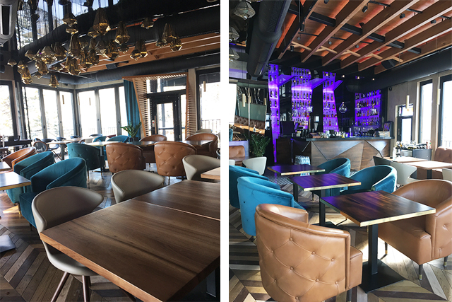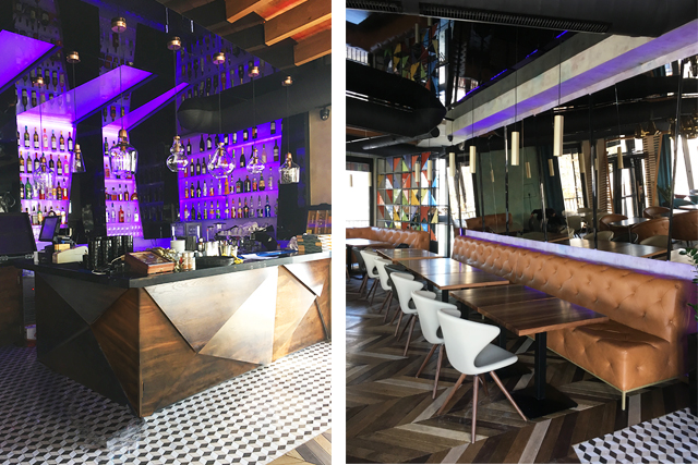 Uklapanjem ploča trougaonog oblika formiran je šank.Za radnu ploču korišćen je crni kamen dok je ostatak šanka furnir bajcovanog hrasta.