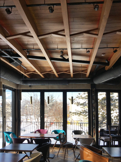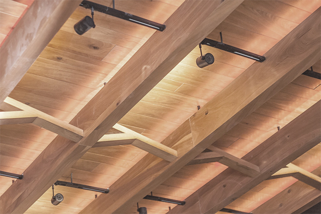 Obloga plafona od hrsta sa masivnim ukrasnim gredama koje nose rasvetu.