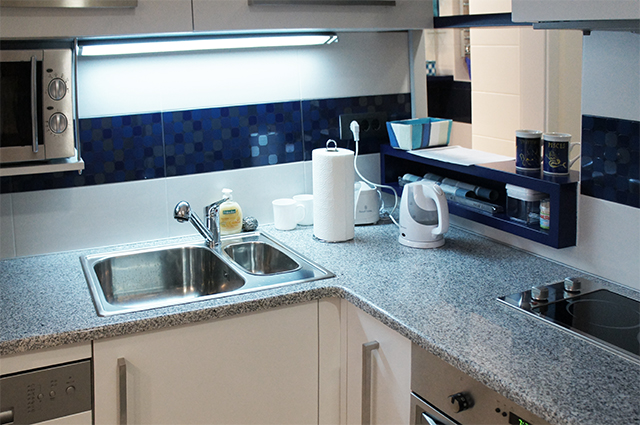 Kuhinja od farbanog medijapana sa granitnom radnom pločom.