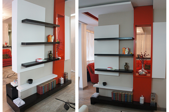 Polica u hodniku od farbanog medijapana sa pregradnim,staklenim zidom.