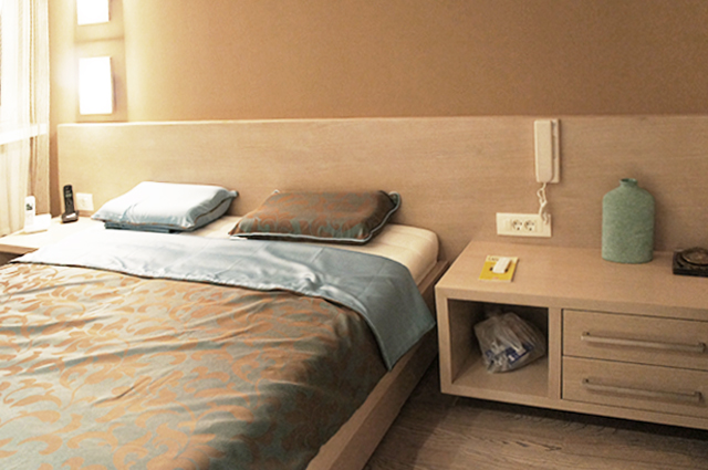 Krevet sa uzglavnicom i natkasnom od furniranog medijapana, u boji beljenog hrasta. Iznad uzglavnice je ugradjena rasveta.