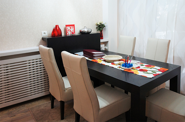 Kuhinjski sto od hrastovog furnira bajcovanog u venge. Radijator maska se sastoji iz dva dela.