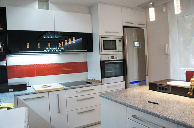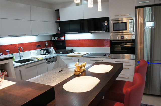 Kuhinjski elementi su izradjeni od farbanog medijapana i furniranog hrasta. Dva fronta visećih elemnata su napravljena od crnog stakla.
