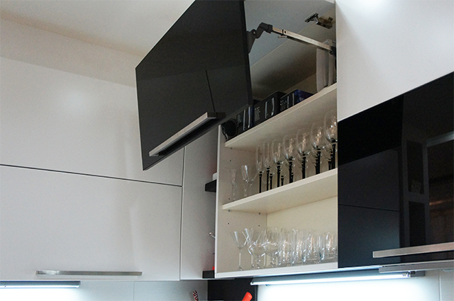 Detalj otvaranja visećih elemenata sa frontom od crnog stakla.