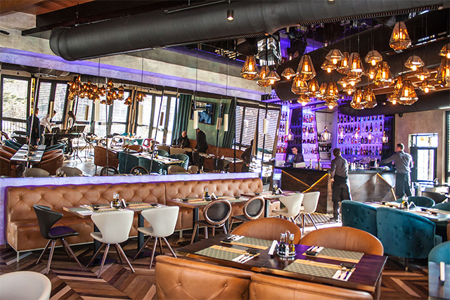 Uklapanjem ploča trougaonog oblika formiran je šank.Za radnu ploču korišćen je crni kamen dok je ostatak šanka furnir bajcovanog hrasta.