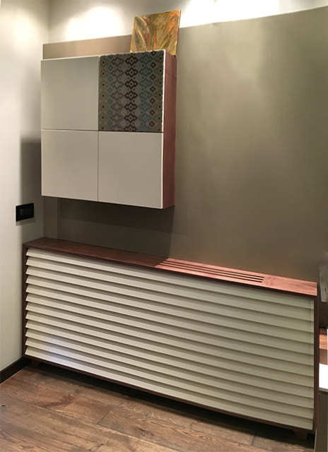 Pri izradi tv komode i radijator maske kombinovani su farbani medijapan i furnir američkog oraha.