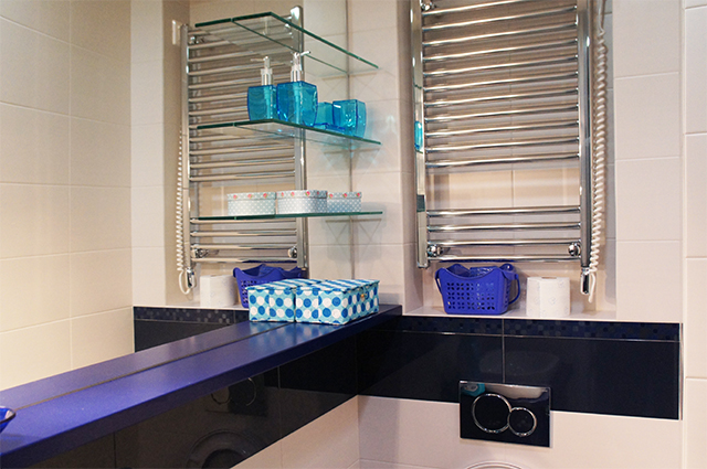 Polica u kupatilu od farbanog medijapana. Za ogledalo su uv lepkom zalepljene staklene police.
