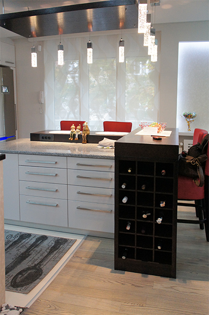 Mini vinarija i spušteni plafon od hrastovog furnira bajcovanog u venge. Granitna radna ploča.